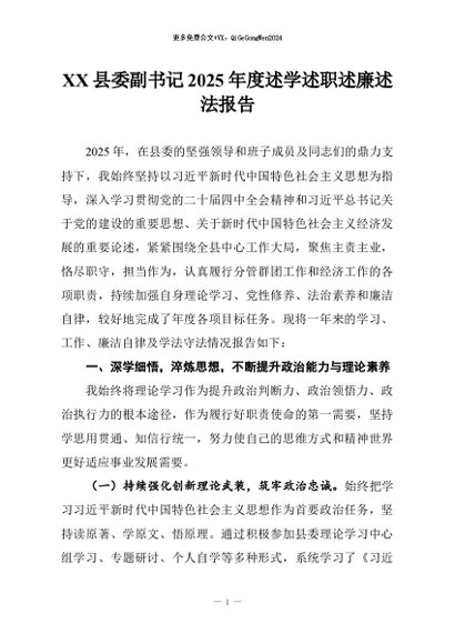 / 【七哥公文】2026年:XX县委副书记2025年度述学述职述廉述法报告+更多免费公文+VX:QiGeGongWen2024