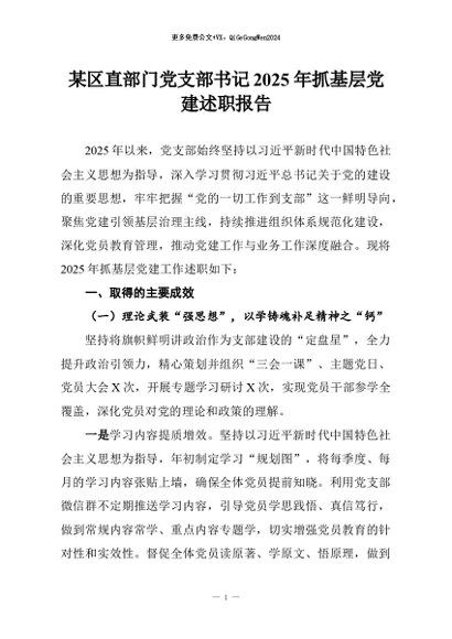 【七哥公文】2026年:某区直部门党支部书记2025年抓基层党建述职报告+更多免费公文+VX:QiGeGongWen2024