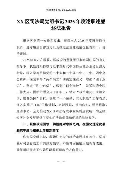 【七哥公文】2026年:XX区司法局党组书记2025年度述职述廉述法报告+更多免费公文+VX:QiGeGongWen2024