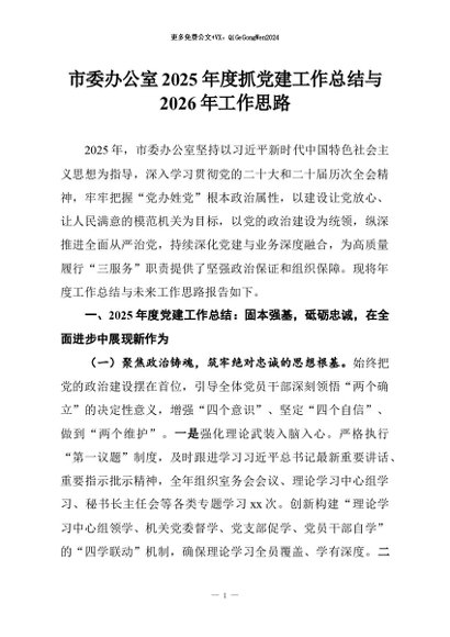 【七哥公文】2026年:市委办公室2025年度抓党建工作总结与2026年工作思路+更多免费公文+VX:QiGeGongWen2024