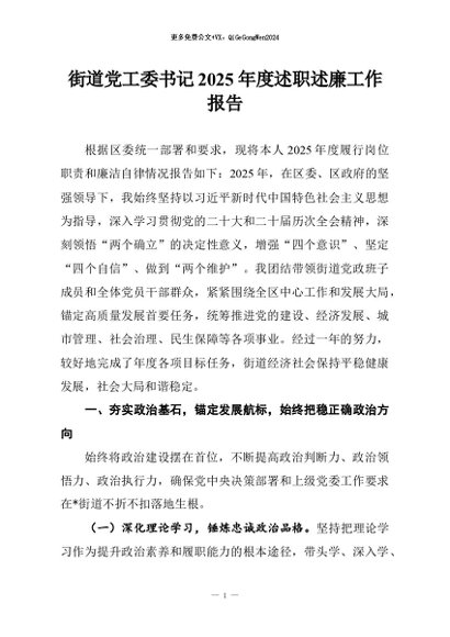 / 【七哥公文】2026年:街道党工委书记2025年度述职述廉工作报告+更多免费公文+VX:QiGeGongWen2024