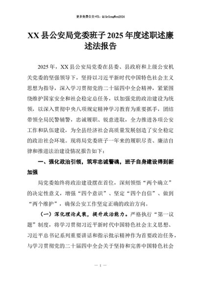 【七哥公文】2026年:XX县公安局党委班子2025年度述职述廉述法报告+更多免费公文+VX:QiGeGongWen2024