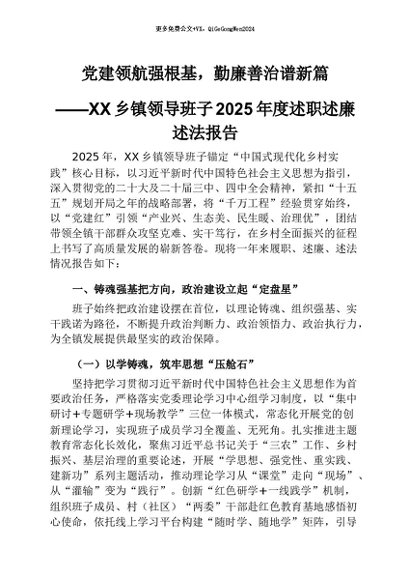 【七哥公文】2026年:XX乡镇领导班子2025年度述职述廉述法报告:党建领航强根基,勤廉善治谱新篇+更多免费公文+VX:QiGeGongWen2024