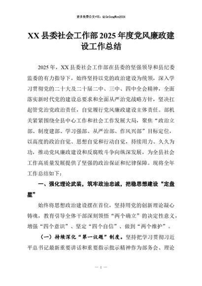 【七哥公文】2026年:XX县委社会工作部2025年度党风廉政建设工作总结+更多免费公文+VX:QiGeGongWen2024