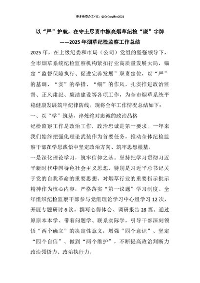 【七哥公文】2026年:以“严”护航,在守土尽责中擦亮烟草纪检“廉”字牌——2025年烟草纪检监察工作总结+更多免费公文+VX:QiGeGongWen2024