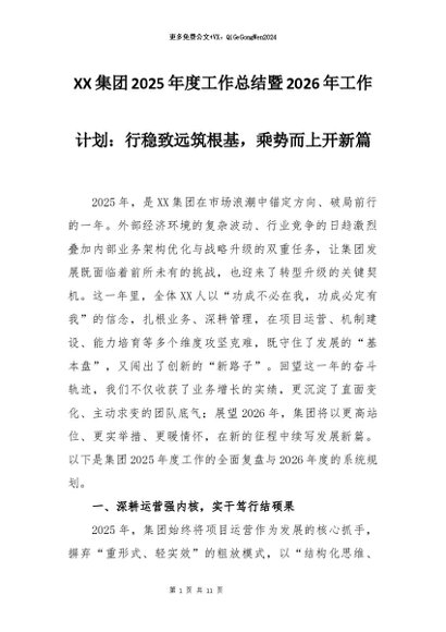 【七哥公文】2026年:XX集团2025年度工作总结暨2026年工作计划:行稳致远筑根基,乘势而上开新篇+更多免费公文+VX:QiGeGongWen2024