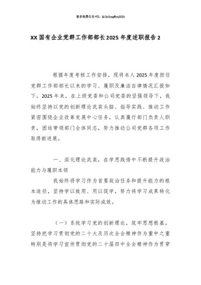 【七哥公文】2026年:XX国有企业党群工作部部长2025年度述职报告2_副本+更多免费公文+VX:QiGeGongWen2024