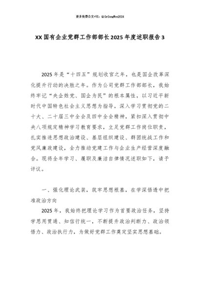 【七哥公文】2026年:XX国有企业党群工作部部长2025年度述职报告3_副本+更多免费公文+VX:QiGeGongWen2024