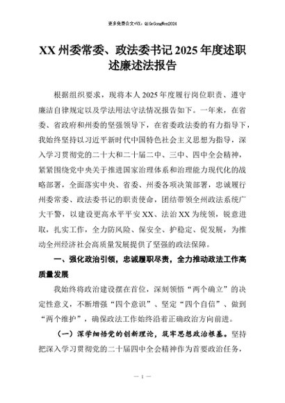 【七哥公文】2026年:XX州委常委、政法委书记2025年度述职述廉述法报告+更多免费公文+VX:QiGeGongWen2024