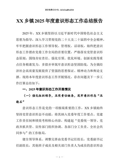 / 【七哥公文】2026年:XX乡镇2025年度意识形态工作总结报告+更多免费公文+VX:QiGeGongWen2024