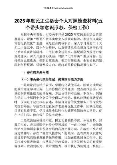 【七哥公文】2026年:2025年度民主生活会个人对照检查材料(五个带头加意识形态,保密工作)+更多免费公文+VX:QiGeGongWen2024