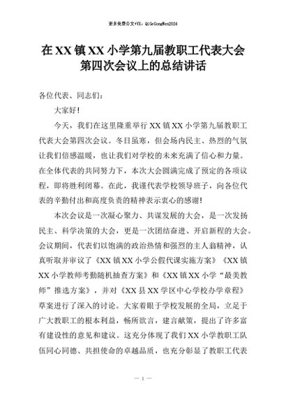 【七哥公文】2026年:在XX镇XX小学第九届教职工代表大会第四次会议上的总结讲话+更多免费公文+VX:QiGeGongWen2024