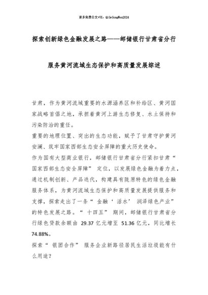 【七哥公文】2026年:探索创新绿色金融发展之路——邮储银行甘肃省分行服务黄河流域生态保护和高质量发展综述_副本+更多免费公文+VX:QiGeGongWen2024