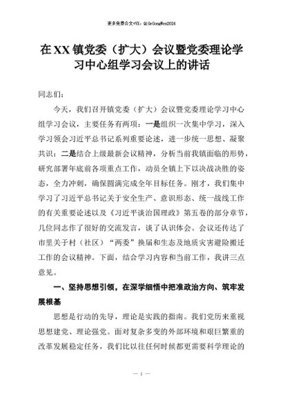 【七哥公文】2026年:在XX镇党委(扩大)会议暨党委理论学习中心组学习会议上的讲话+更多免费公文+VX:QiGeGongWen2024