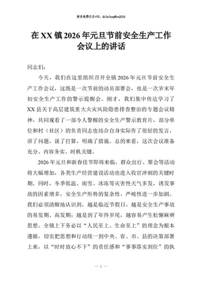 【七哥公文】2026年:在XX镇2026年元旦节前安全生产工作会议上的讲话+更多免费公文+VX:QiGeGongWen2024