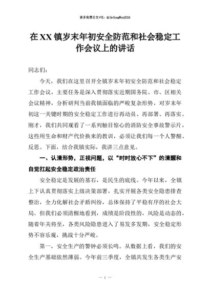 【七哥公文】2026年:在XX镇岁末年初安全防范和社会稳定工作会议上的讲话+更多免费公文+VX:QiGeGongWen2024