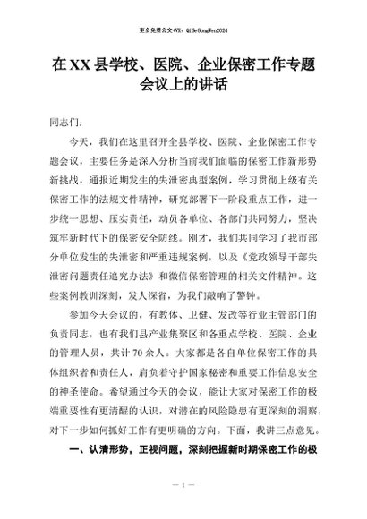 【七哥公文】2026年:在XX县学校、医院、企业保密工作专题会议上的讲话+更多免费公文+VX:QiGeGongWen2024