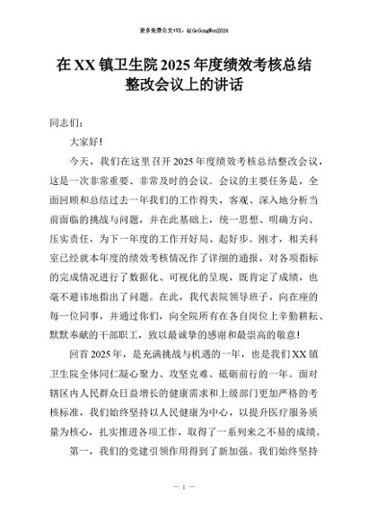 【七哥公文】2026年:在XX镇卫生院2025年度绩效考核总结整改会议上的讲话+更多免费公文+VX:QiGeGongWen2024