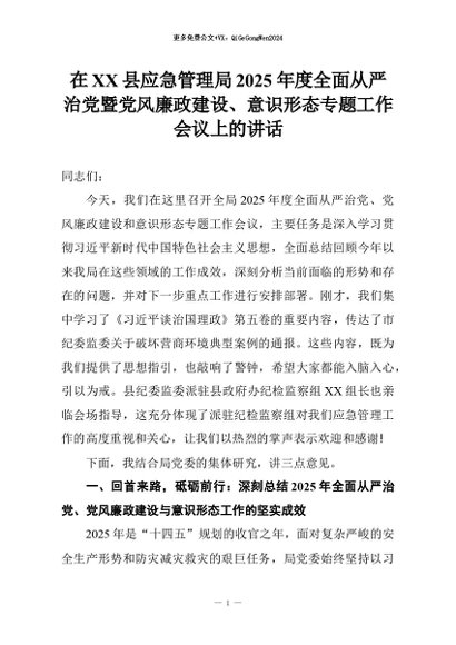 【七哥公文】2026年:在XX县应急管理局2025年度全面从严治党暨党风廉政建设、意识形态专题工作会议上的讲话+更多免费公文+VX:QiGeGongWen2024