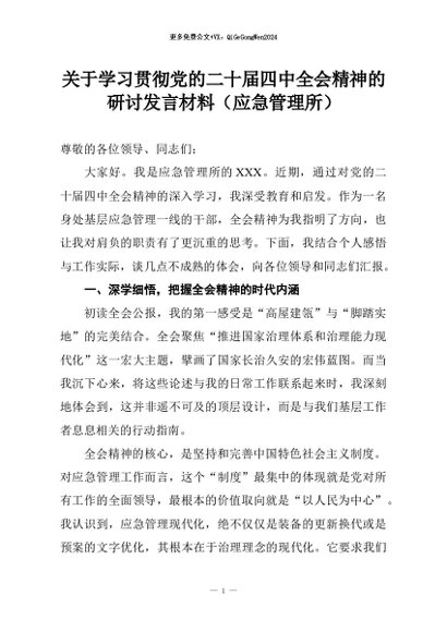 【七哥公文】2026年:关于学习贯彻党的二十届四中全会精神的研讨发言材料(应急管理所)+更多免费公文+VX:QiGeGongWen2024