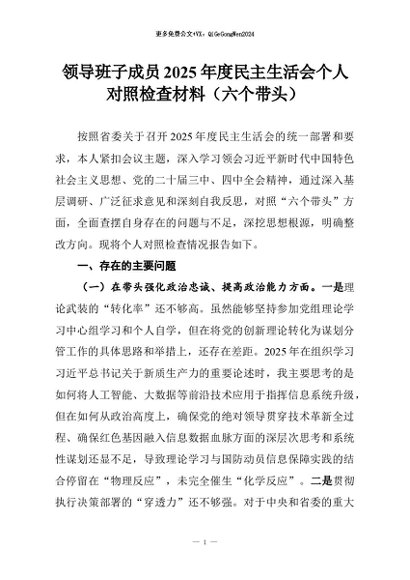 【七哥公文】2026年:领导班子成员2025年度民主生活会个人对照检查材料(六个带头)_副本+更多免费公文+VX:QiGeGongWen2024