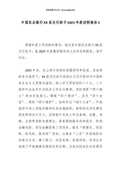 【七哥公文】2026年:中国农业银行XX县支行班子2025年度述职报告2+更多免费公文+VX:QiGeGongWen2024