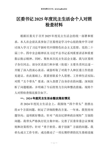 【七哥公文】2026年:区委书记2025年度民主生活会个人对照检查材料_副本+更多免费公文+VX:QiGeGongWen2024
