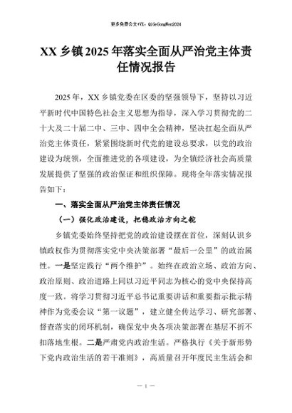 【七哥公文】2026年:XX乡镇2025年落实全面从严治党主体责任情况报告+更多免费公文+VX:QiGeGongWen2024