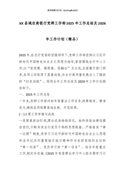 【七哥公文】2026年:XX县域农商银行党群工作部2025年工作总结及2026年工作计划(精品)+更多免费公文+VX:QiGeGongWen2024