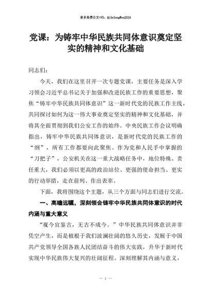【七哥公文】2026年:党课:为铸牢中华民族共同体意识奠定坚实的精神和文化基础+更多免费公文+VX:QiGeGongWen2024