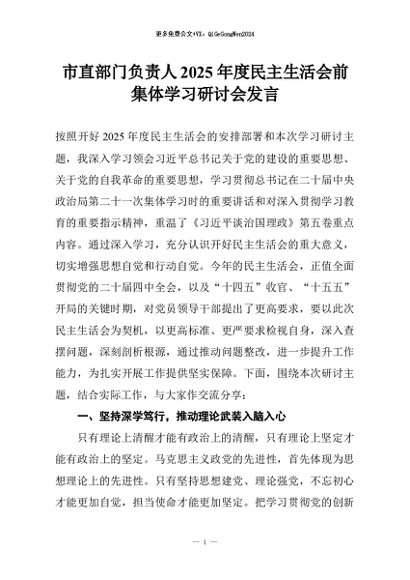【七哥公文】2026年:市直部门负责人2025年度民主生活会前集体学习研讨会发言_副本+更多免费公文+VX:QiGeGongWen2024