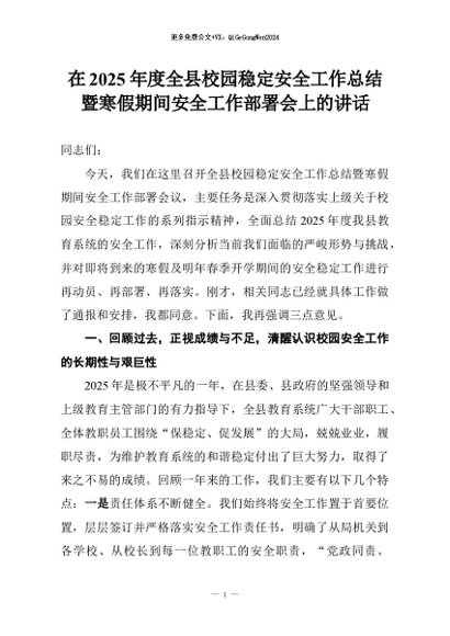【七哥公文】2026年:在2025年度全县校园稳定安全工作总结暨寒假期间安全工作部署会上的讲话_副本+更多免费公文+VX:QiGeGongWen2024