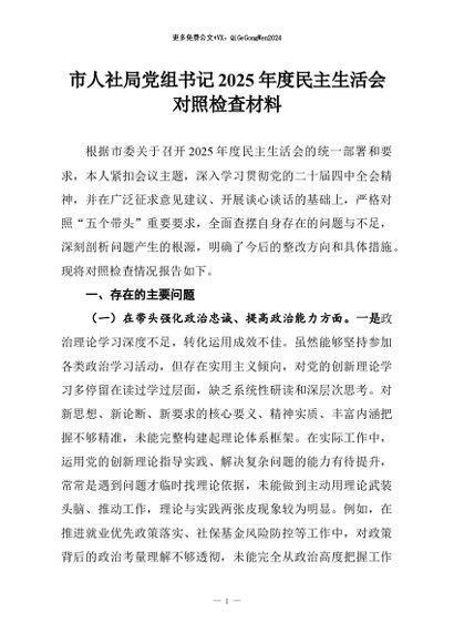 【七哥公文】2026年:市人社局党组书记2025年度民主生活会对照检查材料_副本+更多免费公文+VX:QiGeGongWen2024