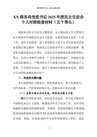 【七哥公文】2026年:XX商务局党组书记2025年度民主生活会个人对照检查材料(五个带头)_副本+更多免费公文+VX:QiGeGongWen2024