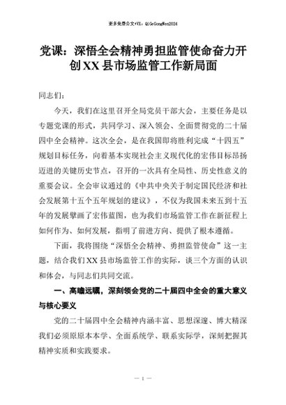 【七哥公文】2026年:党课:深悟全会精神勇担监管使命奋力开创XX县市场监管工作新局面+更多免费公文+VX:QiGeGongWen2024