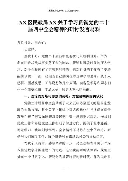 【七哥公文】2026年:XX区民政局XX关于学习贯彻党的二十届四中全会精神的研讨发言材料+更多免费公文+VX:QiGeGongWen2024