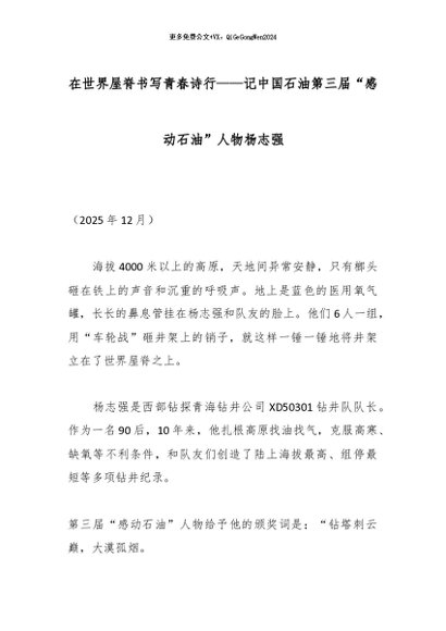 【七哥公文】2026年:在世界屋脊书写青春诗行——记中国石油第三届“感动石油”人物杨志强_副本+更多免费公文+VX:QiGeGongWen2024