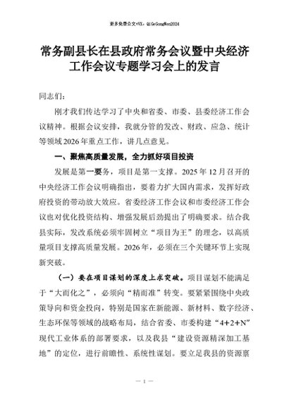【七哥公文】2026年:常务副县长在县政府常务会议暨中央经济工作会议专题学习会上的发言+更多免费公文+VX:QiGeGongWen2024