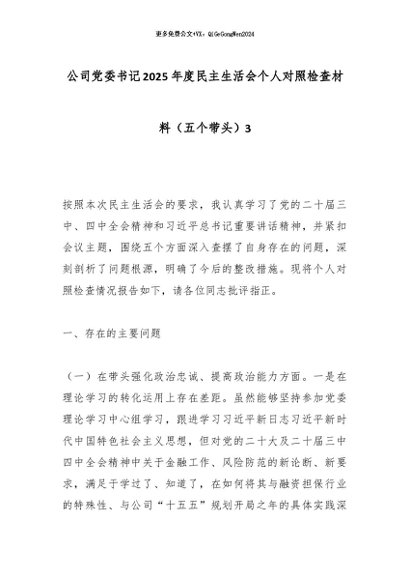 【七哥公文】2026年:公司党委书记2025年度民主生活会个人对照检查材料(五个带头)3_副本+更多免费公文+VX:QiGeGongWen2024