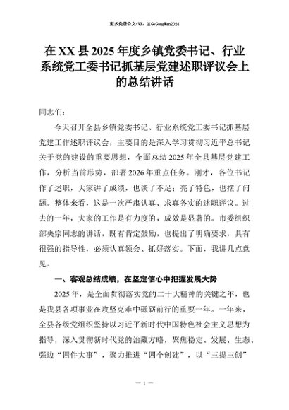 【七哥公文】2026年:在XX县2025年度乡镇党委书记、行业系统党工委书记抓基层党建述职评议会上的总结讲话+更多免费公文+VX:QiGeGongWen2024