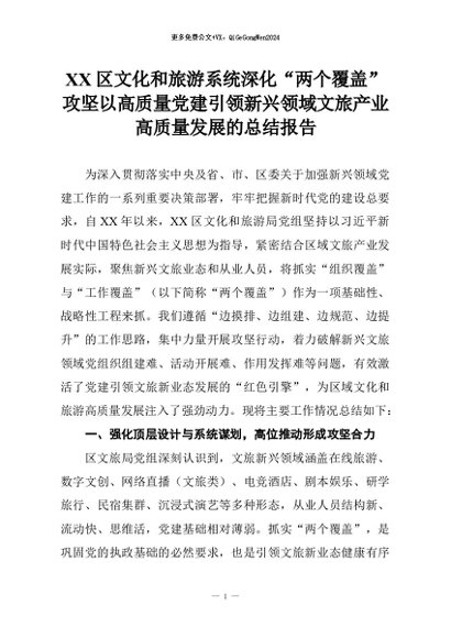 【七哥公文】2026年:XX区文化和旅游系统深化“两个覆盖”攻坚以高质量党建引领新兴领域文旅产业高质量发展的总结报告_副本+更多免费公文+VX:QiGeGongWen2024
