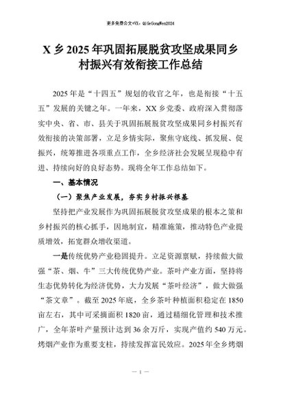 【七哥公文】2026年:X乡2025年巩固拓展脱贫攻坚成果同乡村振兴有效衔接工作总结_副本+更多免费公文+VX:QiGeGongWen2024