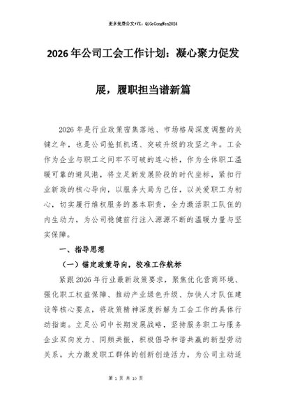 【七哥公文】2026年:2026年公司工会工作计划:凝心聚力促发展,履职担当谱新篇+更多免费公文+VX:QiGeGongWen2024