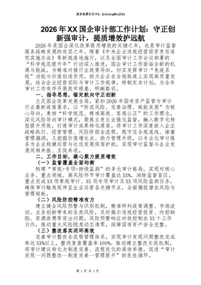 【七哥公文】2026年:2026年XX国企审计部工作计划:守正创新强审计,提质增效护远航+更多免费公文+VX:QiGeGongWen2024