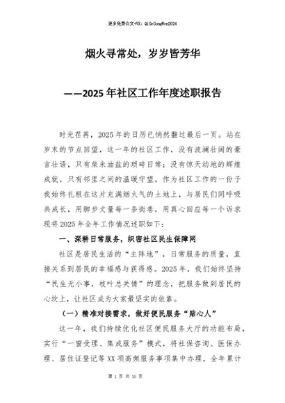 【七哥公文】2026年:2025年社区工作年度述职报告:烟火寻常处,岁岁皆芳华+更多免费公文+VX:QiGeGongWen2024