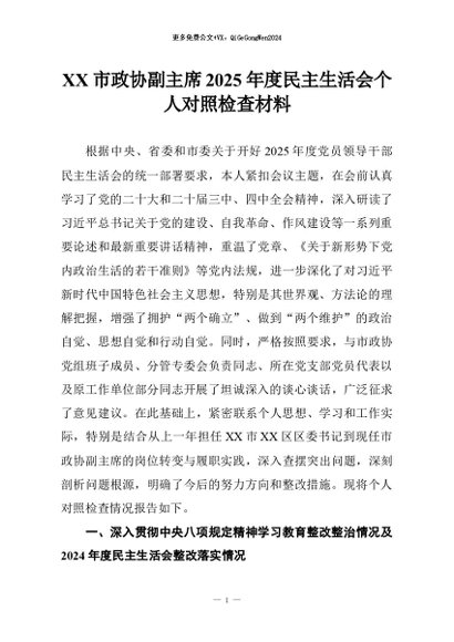 【七哥公文】2026年:XX市政协副主席2025年度民主生活会个人对照检查材料+更多免费公文+VX:QiGeGongWen2024