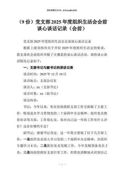 【七哥公文】2026年:(9份)党支部2025年度组织生活会会前谈心谈话记录(会前)+更多免费公文+VX:QiGeGongWen2024