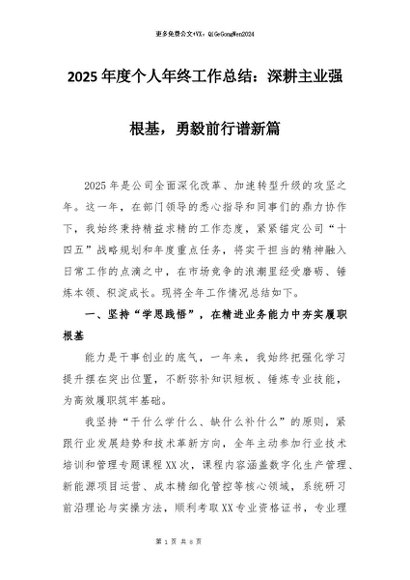【七哥公文】2026年:2025年度个人年终工作总结:深耕主业强根基,勇毅前行谱新篇+更多免费公文+VX:QiGeGongWen2024