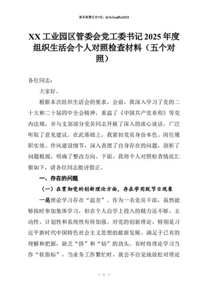 【七哥公文】2026年:XX工业园区管委会党工委书记2025年度组织生活会个人对照检查材料(五个对照)+更多免费公文+VX:QiGeGongWen2024