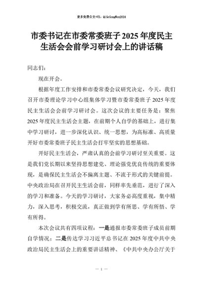 【七哥公文】2026年:市委书记在市委常委班子2025年度民主生活会会前学习研讨会上的讲话稿+更多免费公文+VX:QiGeGongWen2024